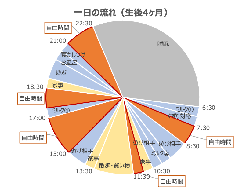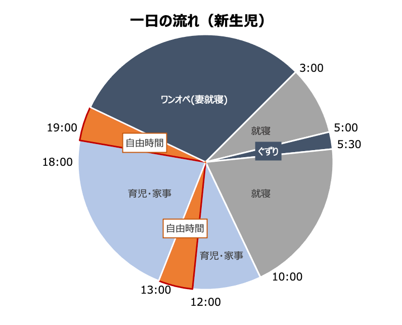 我が家では2ヶ月頃までは睡眠時間を確保のために毎日シフト体制を取っていました。ワンオペタイムはまとまった時間が無かったですが、昼間は2時間くらいは自由に遊べる時間がありました。
