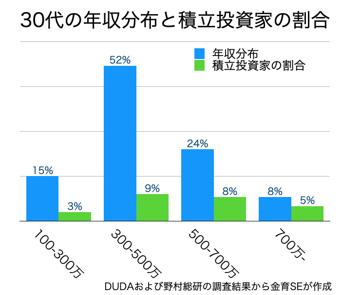前述の野村総研アンケートと合わせて、30代の年収分布(青)と全体に占める積立投資家の割合(緑)を出してみました。
