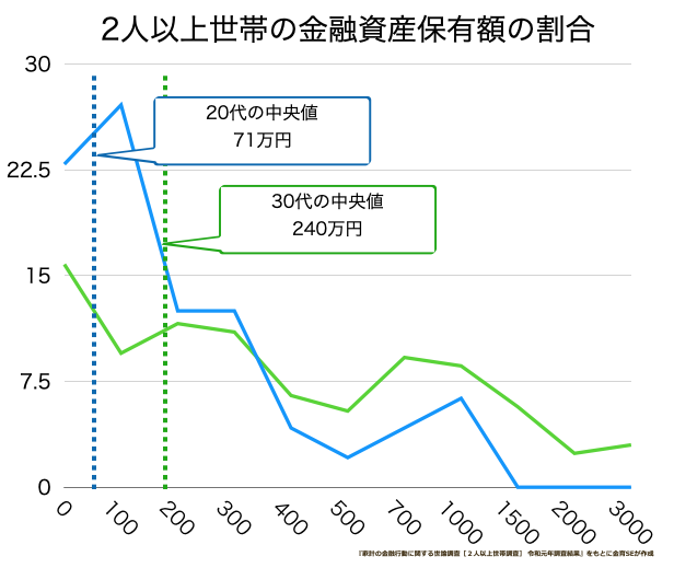 20代では、71万円以下の資産額な人が半数でした。30代になると少し改善し、240万円になります。