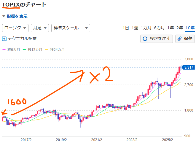 もし10年前に1億円をTOPIXに連動する形で投資していれば、資産は約2倍の2億円以上になっていた可能性が高いんです。