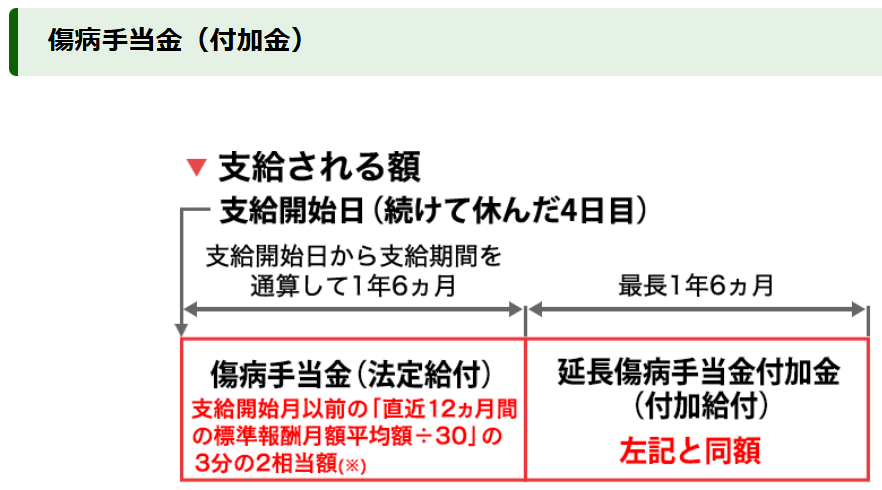 - 傷病手当金付加金: 国の給付(2/3)に加え、給与の約18%を上乗せ。(合計で手取りに近い額が貰えることも)