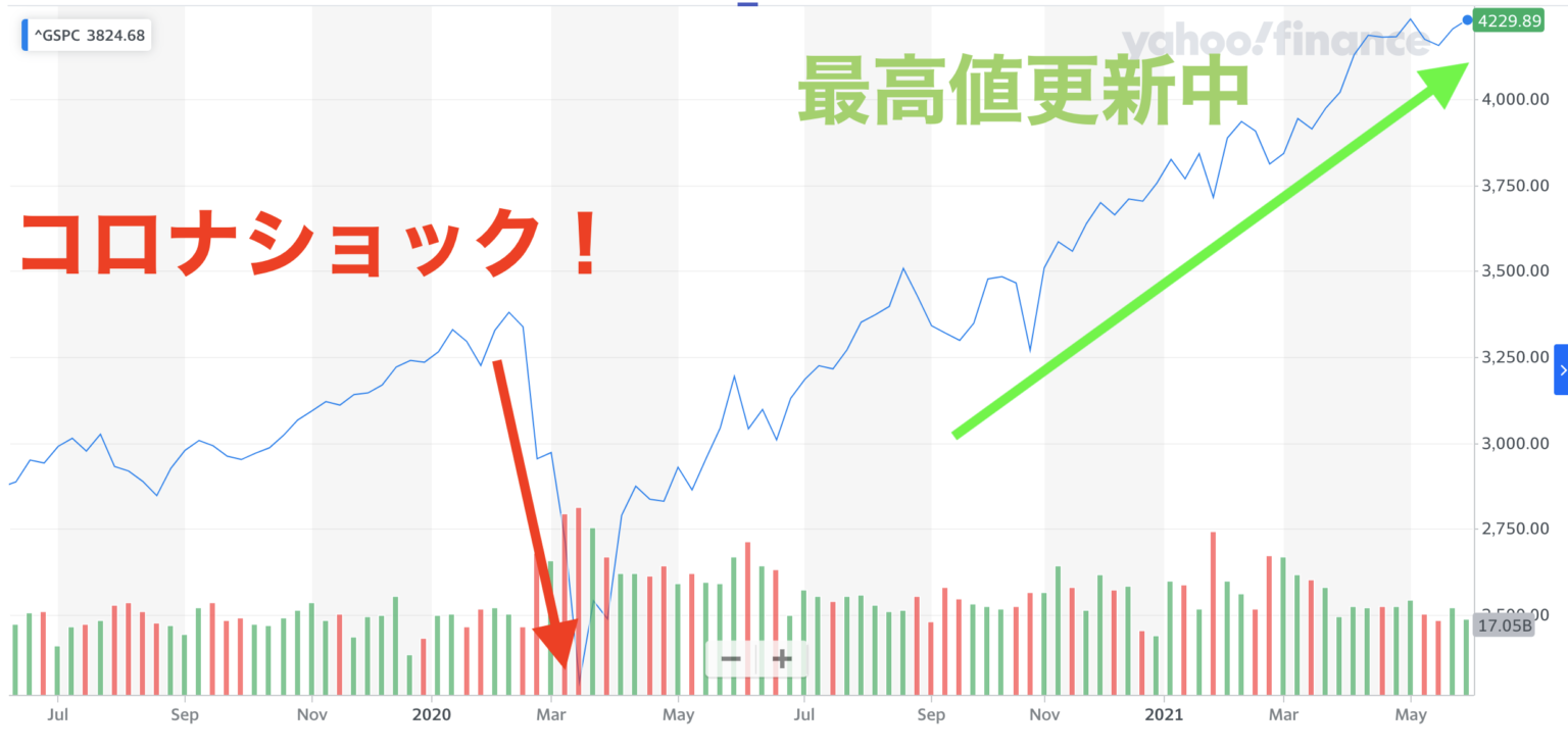 コロナショックを受けて、2020/3に株価が落ち込んだあと、2021/6の現在まで株価はうなぎ登りです。多くの個人投資家が購入しているS&P500インデックスもコロナ前の価格を超えて、過去最高値を更新し続けています。