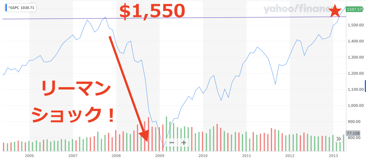 リーマンショックでは$1,550付近で株価が崩壊しました。