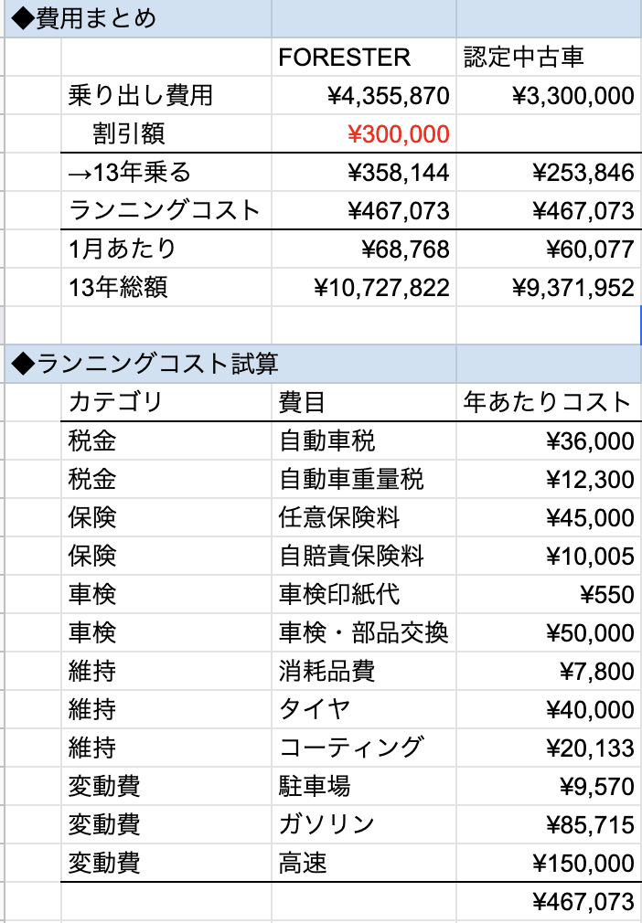 簡単に見積もってみると、私が車を所有するには13年で1000万ほど費用がかかりそうでした。
